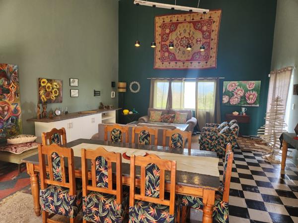 Outdoor living is a key feature, with a generous Erf size of 1867.00 sqm and a Floor Size of 263.00 sqm. The private setting offers scenic views and includes a covered outdoor patio area, ideal for relaxation. Practical amenities such as four dedicated parking spaces and a pet-friendly policy add to the property''s appeal. Sustainability is addressed with a large rainwater collection tank, additional water tanks, and a borehole, promoting water independence. For connectivity, modern satellite internet (Starlink) is installed, and security is provided by an alarm system and perimeter fencing.