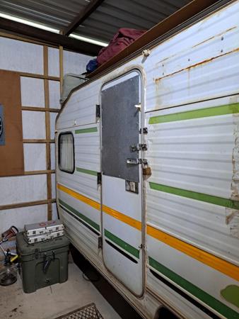 a caravan, a bathroom with a shower, sink & toilet as well as a small kitchenette.