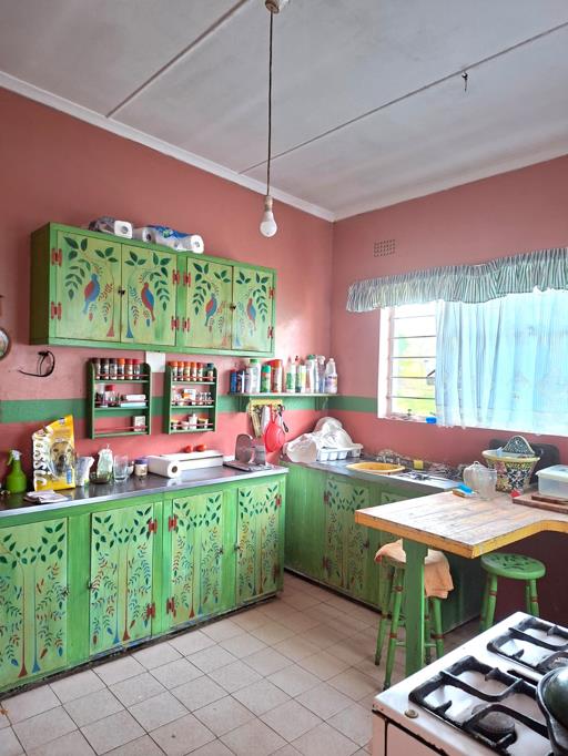 A quirky bright kitchen with plenty of cupboards as well as an adjoining utility room.