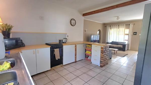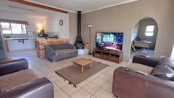 The lounge opens out to a covered patio with a braai overlooking the garden.