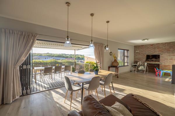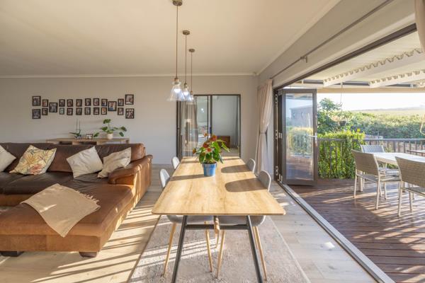 North facing, it presents generous room for both indoor and outdoor entertainment, complete with a stunning indoor braai, and swimming pool facilities. An expansive wooden deck leads out through wide stacking doors from indoor living, and serves as a wonderful extension of open-plan interiors. A sun-filled haven in the afternoon, this is the perfect space to enjoy evening sun-downers and orange skies.