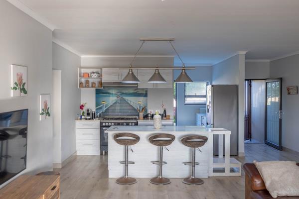 Interior living offers a generous flow throughout, with laminate flooring and a warm coastal feel that will make you feel right at home. A modern kitchen, complete with quartz counter-tops and a center island, boasts a large and separate scullery for convenience.