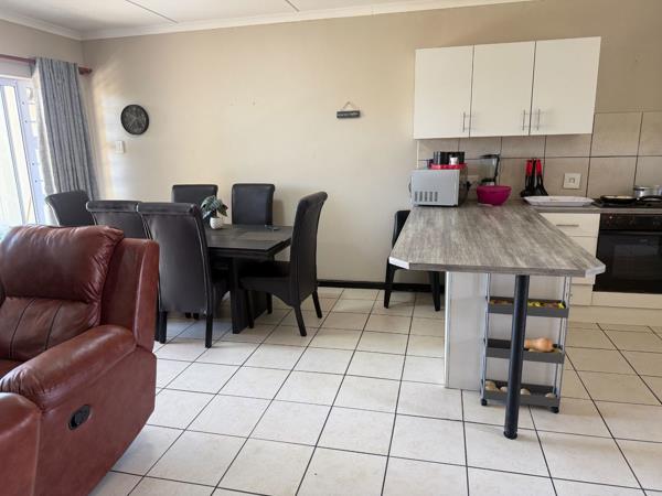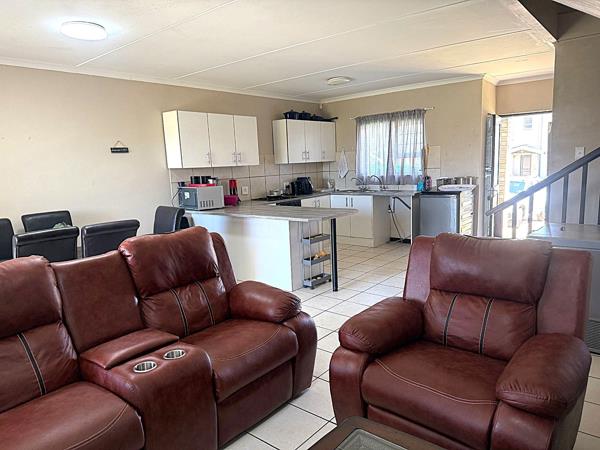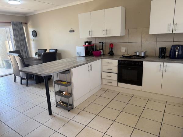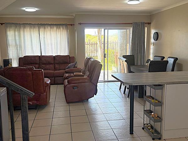 Two Bedroom Townhouse in Emerald Heights. Exclusive Mandate - A well maintained townhouse in a secure complex. Open plan living downstairs consisting of kitchen, dining area and lounge leading to an enclosed patio, braai area and garden. Situated upstairs are two bedrooms and a full bathroom. The main bedroom is spacious and opens to a balcony overlooking the garden and with a distant sea view. The complex has a communal swimming pool and braai area.