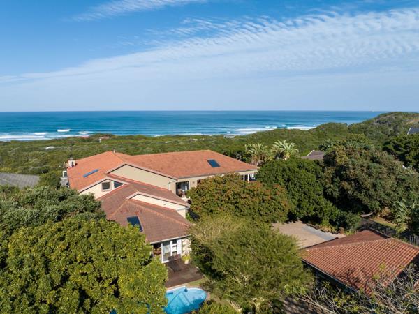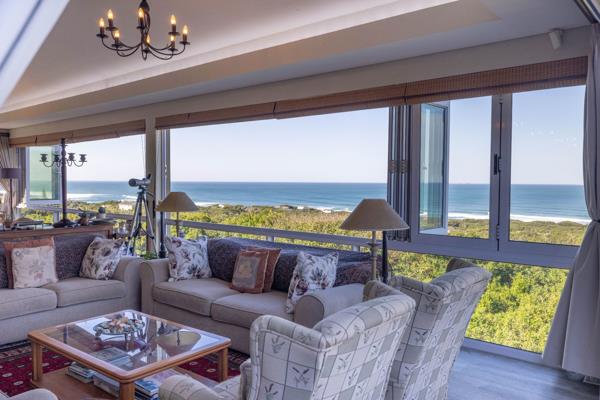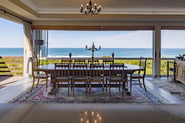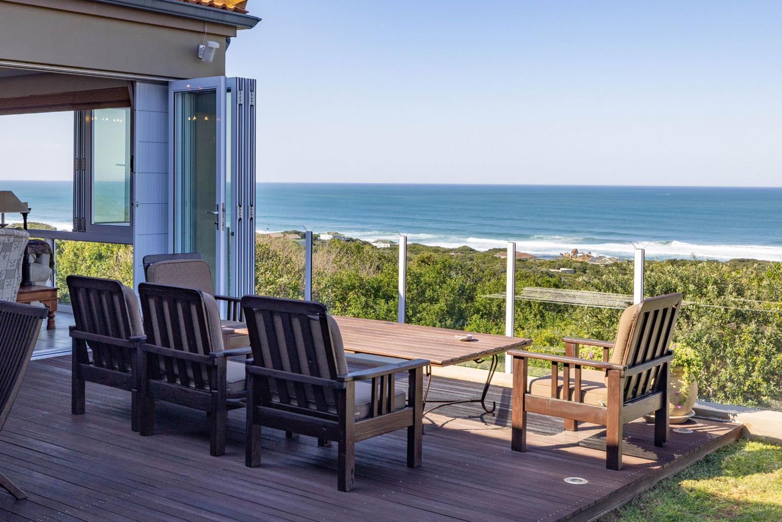 A magnificent ocean view, light and space create an exceptional home. Situated in a sought-after area this extraordinary home is situated in a breathtakingly beautiful indigenous landscaped garden. A sunny entrance hall leads to the tv lounge and flows through to the light and spacious open plan living areas and kitchen from which you can admire stunning views of the ocean. The kitchen is fully equipped with a gas and electric oven, a gas hob and internal gas braai as well as a separate scullery which makes for easy entertaining. In the centre of the open plan living area is an imported wood fireplace, perfect for those winter evenings. The dining and formal lounge area have stacking windows that when fully open create an outdoor feeling. The stacking doors open up onto one of the four Balau decks around the property. There is also a sunroom that opens up onto a deck area with added storage space underneath the deck.