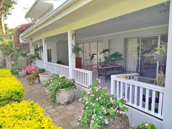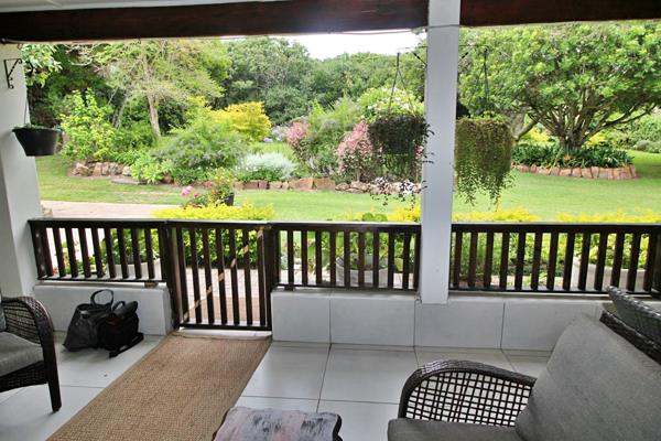 Spacious home set within a beautiful garden situated a short walk to the beach and lagoon.. This unique home is built in such a way to comfortably accommodate visiting family and still have your own space. Separate living areas on either side of the spacious open plan lounge and dining area allow you to have allow this private space. A large veranda welcomes you to the home where a built in braai and smoker oven, forms part of this lovely area from where you can enjoy the view over the beautiful garden.