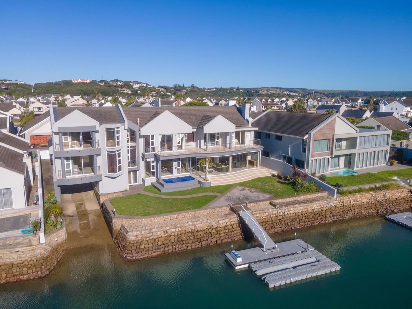 Spectacular Marina Home. Boasting sleek tiled floors, vast glass stacking doors and divine entertainment features, this home defines modernity. It''s appealing architectural design allows a generous flow throughout, emphasizing it''s expansive canal frontage and offering relaxing views from the bedrooms and living areas. This magnificent home includes a private slipway with a boat house, integrated vacuuming and music system and automated blinds. The staircase creates a statement as you enter the architectural wander of this impressively designed home. The open plan living area and exceptional flow optimizes luxurious living, while the kitchen and scullery are fully equipped with Miele appliances. A completely enclosed braai area has been designed with the entertainer in mind and is where privacy and tranquility can be appreciated and enjoyed. A heated plunge pool with incorporated jacuzzi jets alongside the manicured lawns and water''s edge is perfect for ultimate relaxation. All five bedroom have been elegantly designed, each with an En- suite bathroom with heated towel rails as well as exquisite canal views. With luxurious finishes including air conditioning and built in cupboards with cupboard heaters, it provides ample space for extended family or friends. A sperate games or TV room has its own bathroom as well as a pool table and a tennis table. As an added extra there is a guest loo as well as a servant''s quarter equipped with its own bathroom. Additional features include a bar equipped with three bar fridges, a 50,000Lt underground water tank complete with a water filtration system, a private deep water jetty with a DockPro dry dock and a Yamaha 242 Limited S Jet Boat for your enjoyment. Home to some of Port Alfred''s most exclusive and upmarket properties, the Royal Alfred Marina is renowned for its luxurious setting. The first of its kind in South Africa, this unique property development consists of five islands within a 45 hectare private estate in the Kowie River Estuary. The islands are linked by arched bridges across the canals and all homes have tidal water frontage of at least 15 meters, and private jetty access. Communal facilities include use of squash, tennis and swimming pool amenities. The estate boasts excellent 24hr manned security and is equipped with CCTV monitors along all boundaries, ensuring safety and peace of mind toward a secure environment.