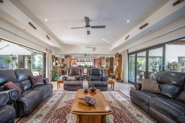 The main home has a very spacious lounge with built-in bookshelves, TV display unit and the dining room which easily fits a 12-seater table. This living area opens via large aluminum stack doors to the private, protected pool area on one side and to the patio overlooking the beautiful manicured garden.