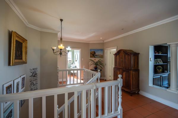 A hallway with dining room on the right of the entrance, leading into a comfortable lounge, superb views. Next to the lounge an open plan TV lounge, kitchen and scullery with enclosed washline area at the back of the home. The TV lounge leads onto a balcony with views of the beautiful garden and pool. A fireplace in the lounge and TV area, perfect for chilly evenings. The double garage leads onto the top floor landing, easily accessible.