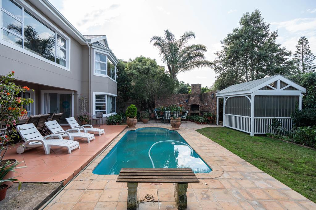 Upstairs there is a large bedroom en- suite. Downstairs there are four bedrooms and two bathrooms. There is an entertainment lounge and bar with built in braai leading out onto the patio area and pool. An ideal storeroom tucked away next to the bar area. An ideal spot for a cellar. The garden is filled with clivias. The open patio area is an ideal spot to sit while your children are playing in the pool.