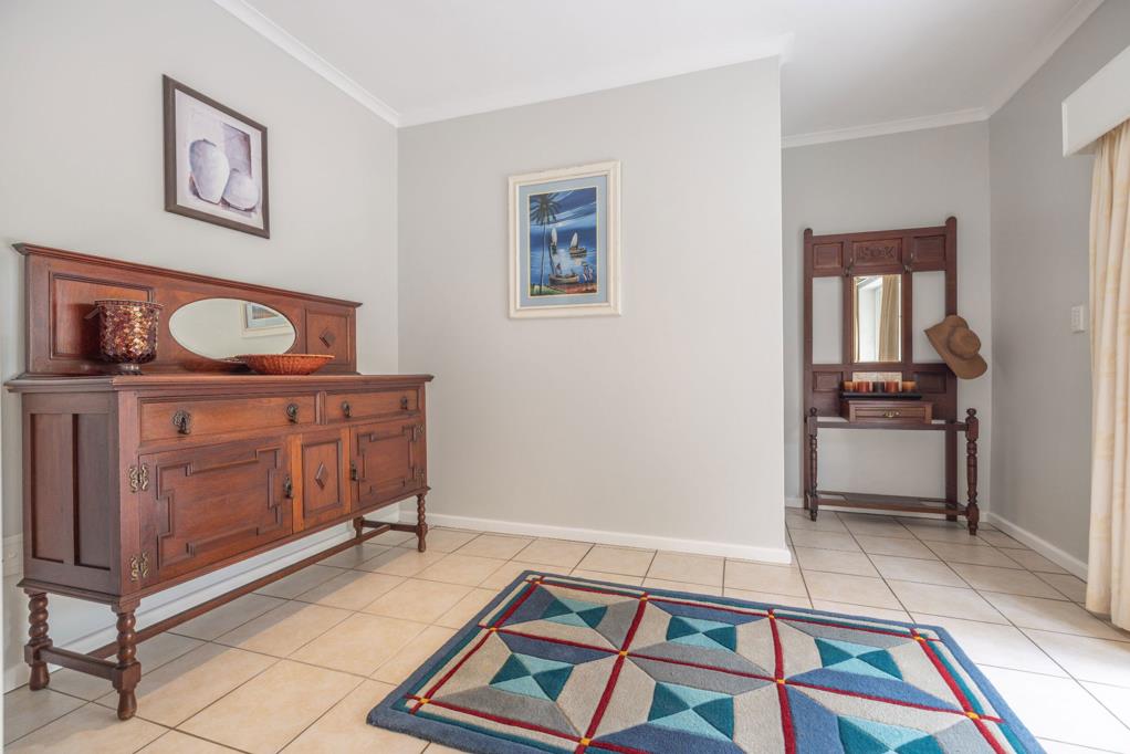 The kitchen leads off from the dining area, and is fitted with granite tops and melamine cabinetry. Complete with an under-counter oven, an electric hob, and a separate scullery this space is suitably equipped to cater to your culinary needs.