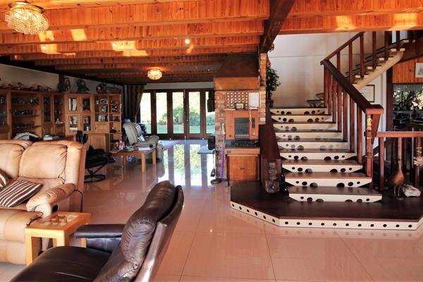 A raised rim-flow pool and steam room, enclosed with aluminium stack doors which open to a wooden deck overlooking the river and garden view. A tandem garage beneath the pool and two large garages beneath the house offers parking for ten vehicles. A workshop, laundry and storage space are adjacent to the garages on the ground floor and an area is available for a lift shaft to be installed for access to the first and second floor. Added extras are security beams, 40 000 litre rainwater tanks, piping for underfloor heating and a deep water jetty on the river.