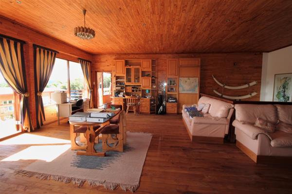 A wide staircase leads upstairs to a family/hobby room and two en-suite guest rooms. The large main bedroom suite has a mirrored dressing room and bathroom with jacuzzi bath, shower, bidet and double basins. The copper flue pipe from the fireplace provides heating upstairs. All rooms open to the extended balconies on either side of the home.