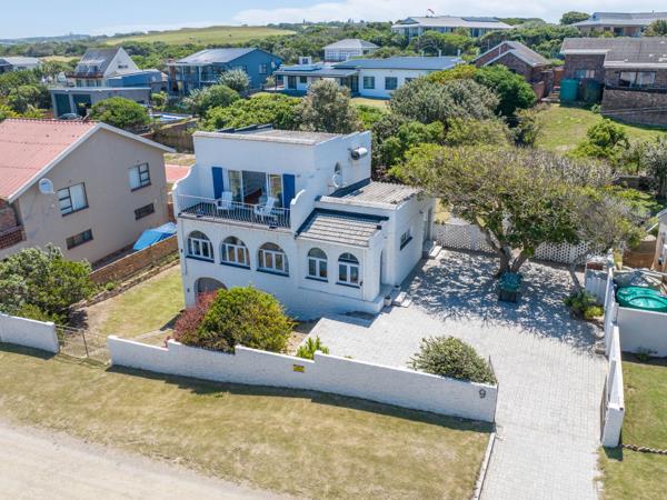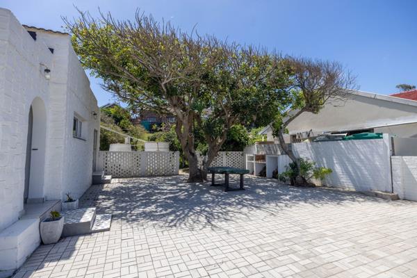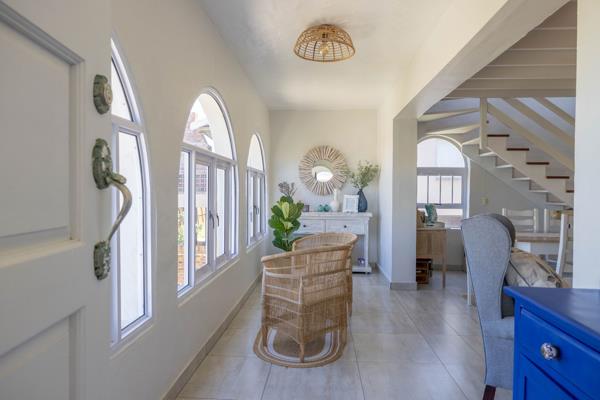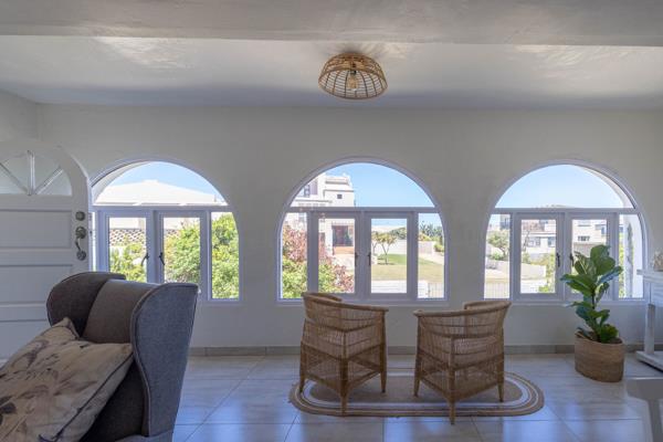 Upstairs, the private main bedroom features an en-suite bathroom, while a second lounge leads out to a balcony showcasing captivating sea views. Outdoors, a paved patio with built-in braai shaded by a beautiful tree, creates the perfect setting for effortless coastal entertaining.