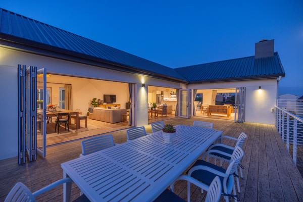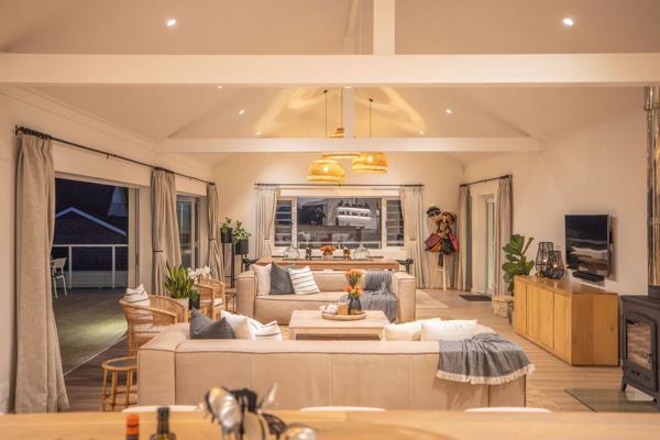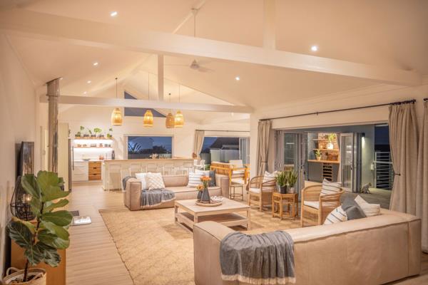 A well-designed layout complements modern-day living, with vaulted ceilings, exposed beams, and laminate wood flooring adding character. The main living area comprises a spacious lounge, dining room, and kitchen, with a stunning indoor braai area opening onto outdoor decks on both the eastern and western sides. Fitted with built-in cabinetry and shelving, this space lends well to effortless entertainment, boasting exquisite coastal views.