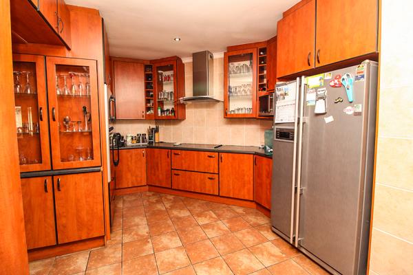 The interior boasts a large lounge and dining room. The kitchen is well-equipped with built-in cupboards and is complemented by a separate scullery and laundry area for added convenience. The expansive entertainment area, complete with a built-in braai, seamlessly flows onto a sparkling pool and a well-maintained backyard, perfect for outdoor gatherings.
