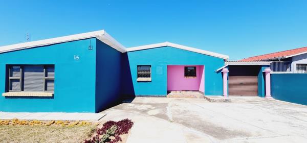 The property in Algoa Park, Port Elizabeth, presents a secure and private environment. A high perimeter wall, featuring a vibrant teal with pink/purple accents, ensures enhanced privacy and security, complemented by separate pedestrian and vehicle gates for convenient access. This distinctive frontage offers a unique first impression.