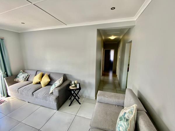 This home offers 3 bedrooms with built-in cupboards, 2 bathrooms (1 mes), stunning modern fitted kitchen, family room, lounge with sliding door to entertainment area, storeroom, enclosed carport for 4 vehicles, all on enclosed erf with sliding gate on remote.