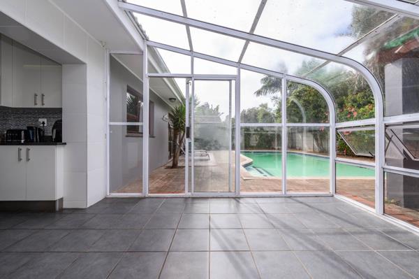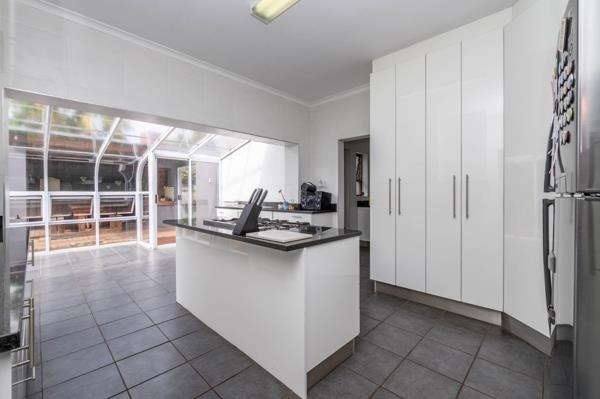 Step inside to discover a thoughtfully designed interior spanning 337 sqm. The home boasts two lounges, a dedicated dining room, and a family TV room, providing versatile spaces for relaxation and entertainment. The modern kitchen is a highlight, featuring sleek white cabinetry, dark granite countertops, a central island with an integrated gas hob, and stainless steel appliances. This culinary space seamlessly connects to a bright, glass-enclosed conservatory, extending the living area and offering abundant natural light. Further enhancing the entertainment options is a dedicated recreational room, complete with a pool table and comfortable seating, perfect for gatherings.
