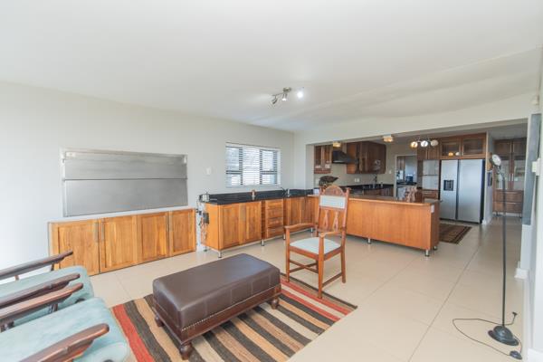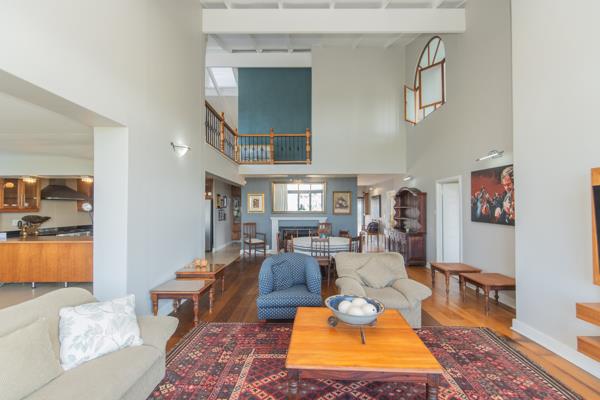 The lower level is ideal for entertaining, featuring a vast open-plan living area with an indoor braai that opens onto a patio and expansive lawn. A second kitchen, wine cellar, and an oversized bedroom with a full en-suite bathroom make this space perfect for guests or dual living.