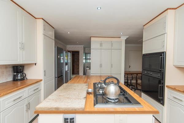 The spacious farm-style kitchen is equipped with eye-level ovens, a central island with a gas stove, pantry, and scullery, making it perfect for culinary enthusiasts.