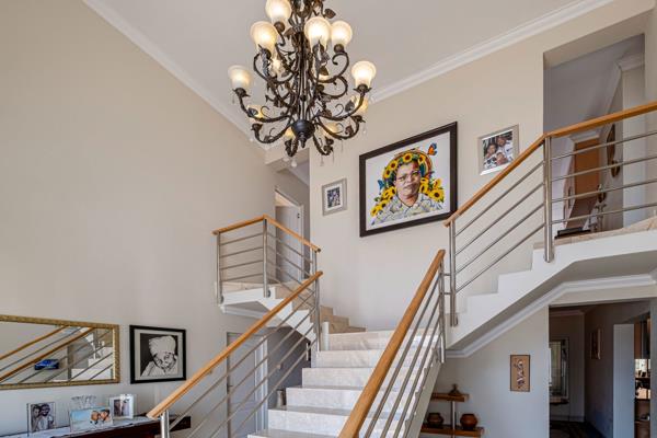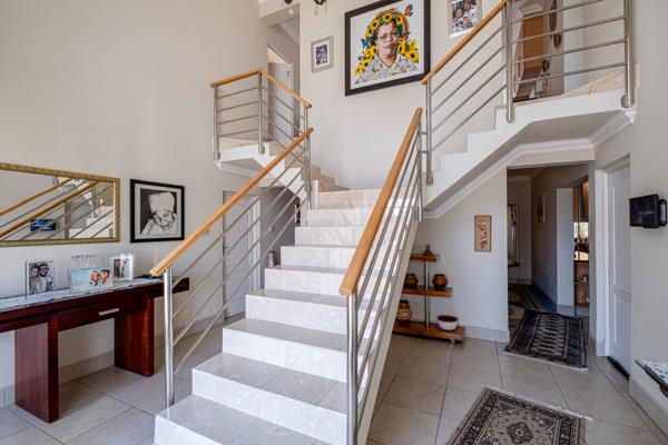 The front of the property boasts three garages on remote with a paved forecourt for guest parking, a tandem garage and a double volume, pillared portico. Double glass front doors open into a marble-tiled entrance with a breath-taking marble and stainless steel staircase that leads upstairs. Illuminated by a chandelier, this elegant, towering and light-infused space is the perfect gallery for artworks.