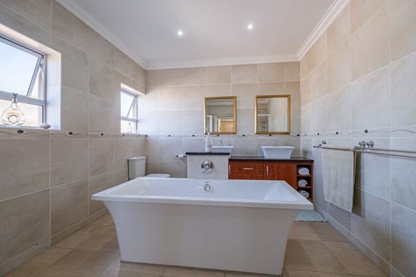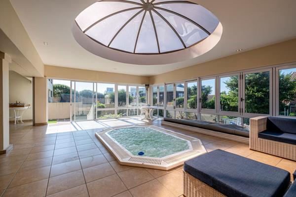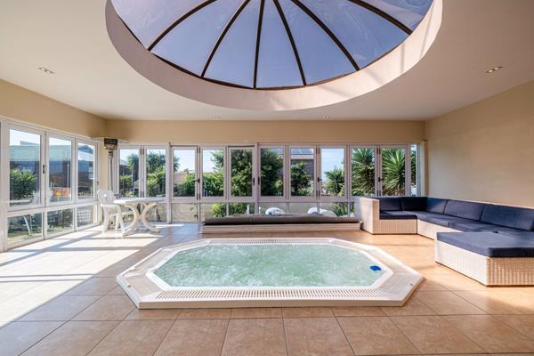 Within the living area footprint is a maple and granite cordon bleu kitchen, an open-plan dining room for elegant hosting, a beautiful formal lounge with plush carpets and a sliding door to the garden, and a TV lounge with a fireplace, built-in display unit. A huge sliding door takes you into the enclosed entertainment area, where a domed skylight allows natural light to flood inside, a gorgeous modern Jacuzzi bubbles its invitation, and a gas braai lies ready for fun times with family and friends. Banks of aluminium-framed windows fold right back to merge the interior with the outdoors on summery days, and allow the salty-scented sea breeze inside. The kitchen is fitted with high-end gas and electric appliances and an inviting breakfast counter for quick meals and sociable sundowners with the chef. Out of sight, the matching scullery and laundry keeps everything neat and tidy. Also on the ground floor is a guest bedroom and adjacent a fitted storeroom. There is also a maids quarters with seperate entrance fitted with a basin bath and shower and kitchenette.