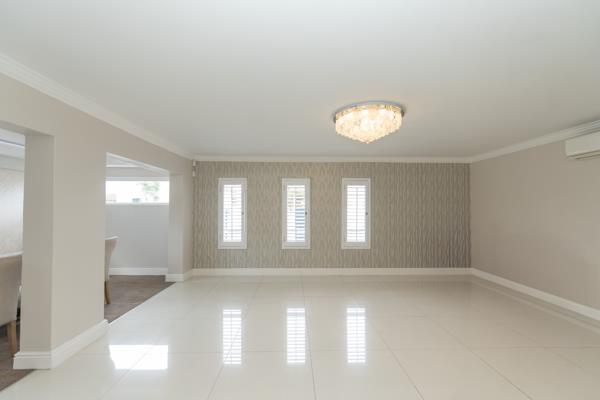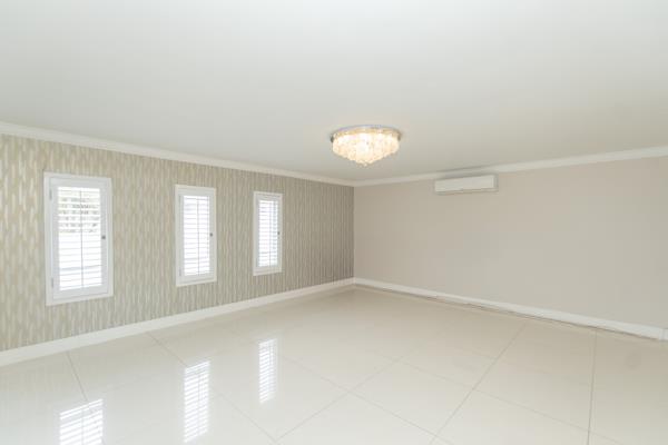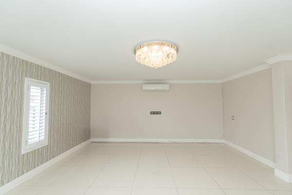 Upstairs, a light-filled landing leads to another bedroom, a full bathroom, and a large lounge with an indoor braai, opening onto a balcony with sweeping views. This floor also features the luxurious master suite, complete with extensive built-in cupboards and a spa-like en-suite bathroom.