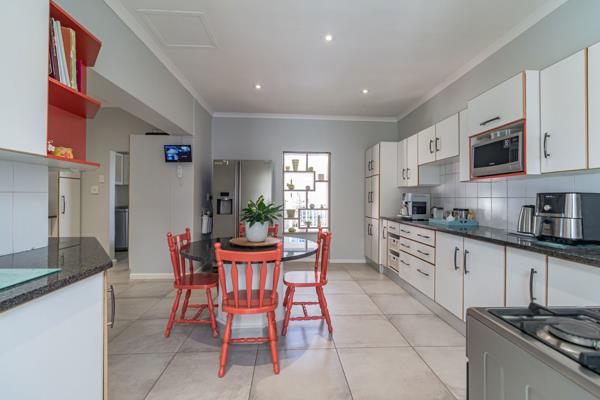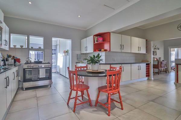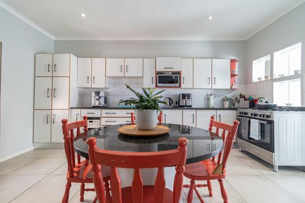 The kitchen, another great gathering place thanks to a round built-in centre table, boasts a contemporary freestanding cooking range with gas burners and an electric oven, ample storage, and a separate scullery with connections for all the appliances and a double stainless steel sink. Theres also a separate laundry room nearby.