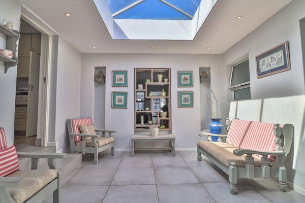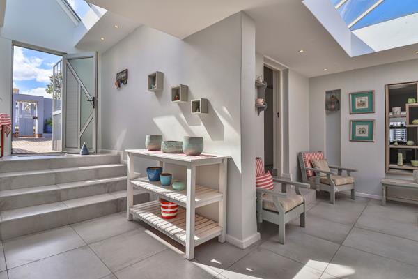 The property has its own gate to the beach, which is just a few steps away no buildings in front! Its also fully walled with electric fencing, automated front gate, an alarm, burglar bars, and Trellidors for absolute peace of mind and complete privacy. From the paved forecourt, the home welcomes you into a grand entrance hall with pitched skylights that allow masses of natural light inside. Alongside is an office, bedroom with aircon and bathroom, which can easily be transformed into an income-generating flat or guest accommodation.