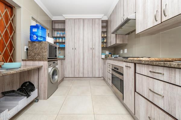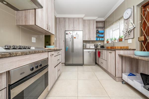 The modern kitchen, with ample cupboard space, is conveniently located near the living areas, making meal preparation and serving effortless.
