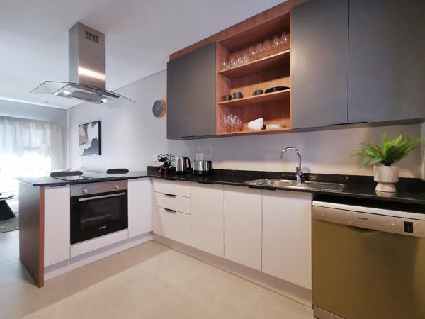 Introducing a sleek and contemporary ground floor apartment in the prestigious Tokai Apartments. This modern unit features 2 bedrooms and 1 bathroom. The open-plan kitchen seamlessly blends with the living area and boasts granite countertops, a ceran hob, and ample storage space. A standout feature is the covered patio with a built-in counter top.