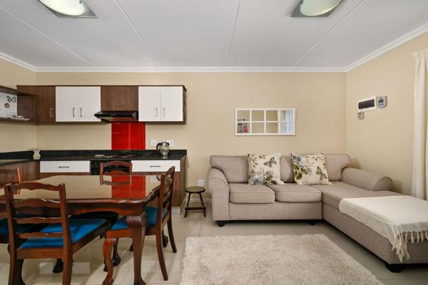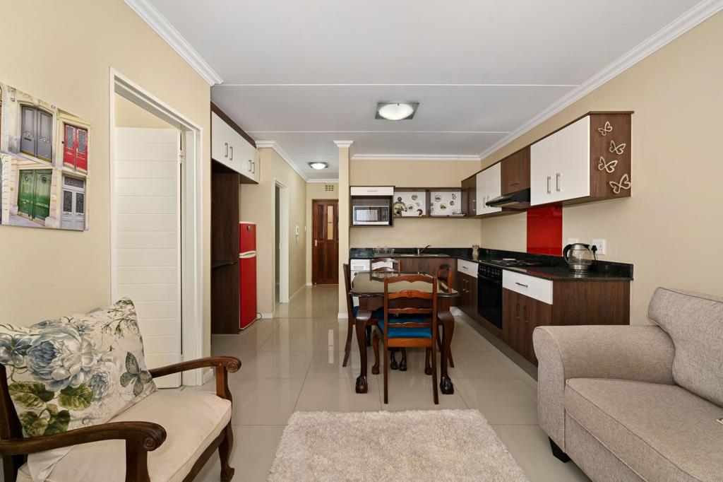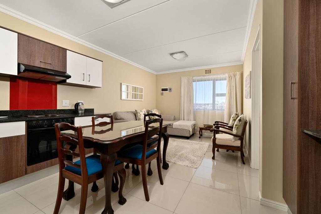 A cosy and charming unit offering spacious built in cupboards granite surfaces aluminum windows dishwashing connection point and a double sink. This unit is equipped with all furniture and appliances apart from the dining room table. Leading to the open plan lounge area that is fully tiled.