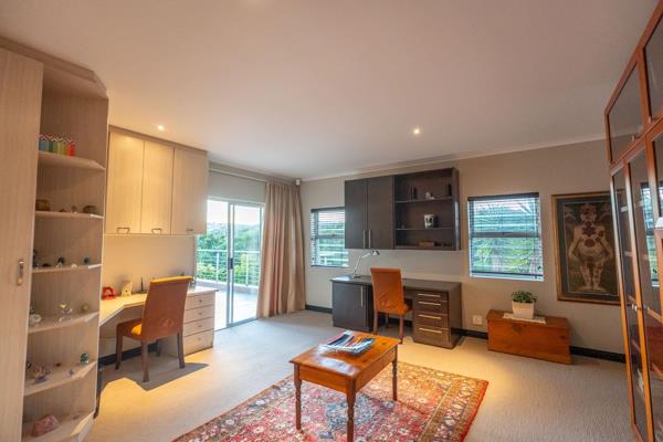 This four bedroom double storey architectural gem combines elegant design with a peaceful country lifestyle. Framed by high glass panels and a striking chandelier, the entrance hall leads to the sunlit bedrooms upstairs. The gracious main bedroom is en-suite and air-conditioned. Both the main bedroom and study open onto a shared private balcony, welcoming the sounds of nature. Bedrooms have ample built in cupboards and plush carpets, bathrooms are tiled. The rest of the home has solid light oak wooden flooring.