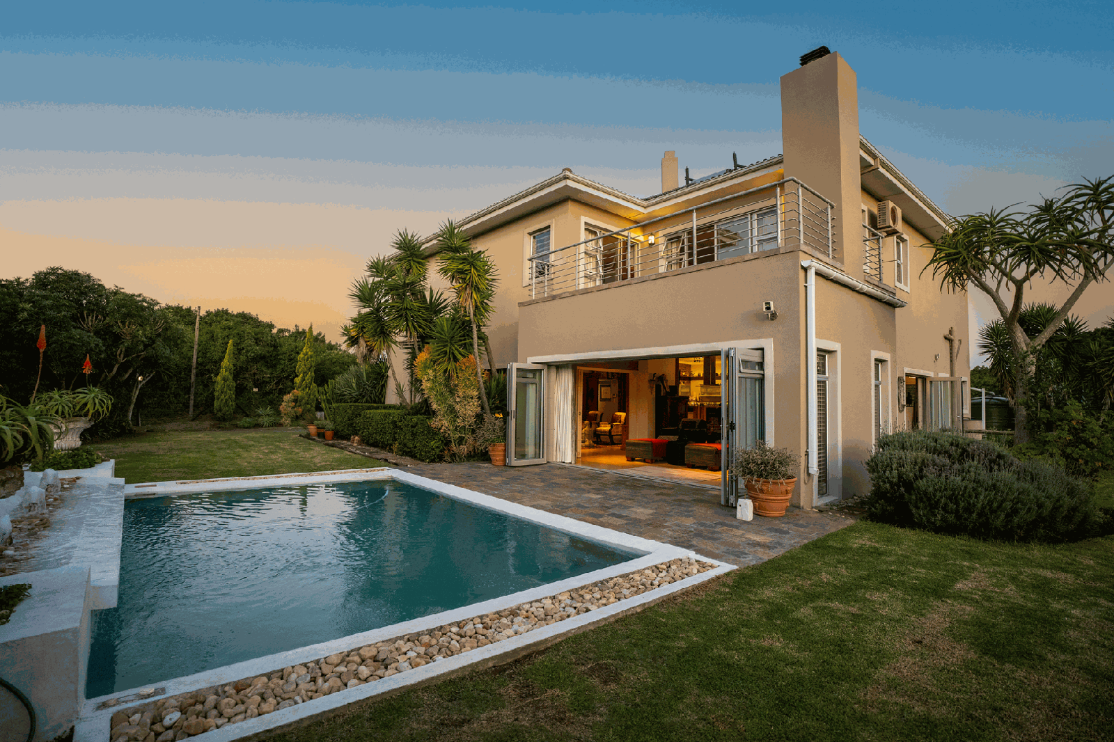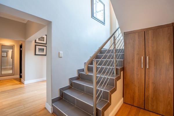 Downstairs is designed for effortless entertaining. An open-plan gourmet kitchen with gas hob and private scullery flows into the dining room and private lounge, divided by a double-sided gas fireplace. A built-in stainless steel braai completes the vibrant space, which opens onto a landscaped garden and sparkling pool with a magical water fountain. As dusk falls, the garden lights up via a day/night switch, creating a magical backdrop. The garden is a private haven, manicured and filled with birdlife and little roaming animals, such as tortoise.