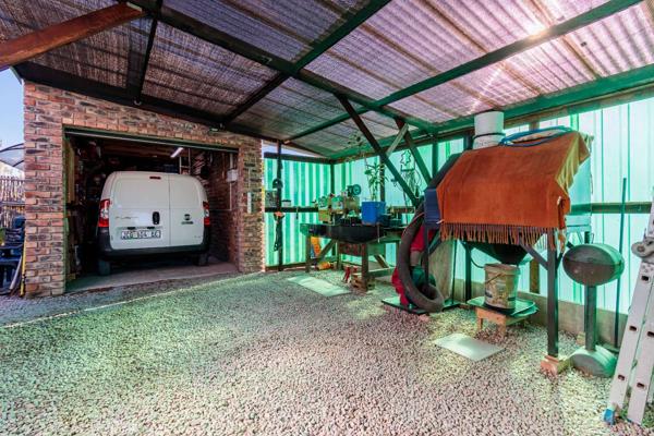 Emphasizing eco-friendliness, the property includes a solar geyser and a 2000L water tank designed to harvest rainwater, reducing your ecological footprint. The single garage measures 3m x 6m and is complemented by a tandem carport with an integrated workshop area, perfect for hobbyists and DIY enthusiasts.