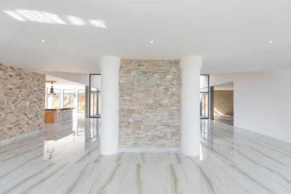 Modern kitchen with marble countertops, a large island, and an open flow to the dining and lounge areas.
