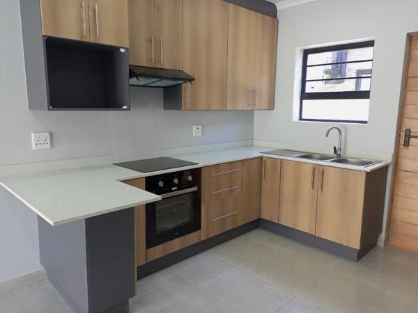 A sleek, modern kitchen flowing into an open-plan dining area, leading to a built-in braai ideal for entertaining.