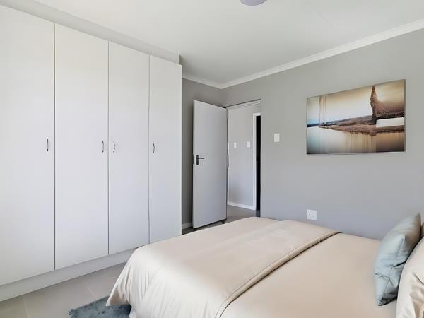 This brand-new semi-detached townhouse offers two bedrooms and one bathroom, with a modern open-plan kitchen and lounge. The kitchen features granite countertops, built-in cupboards and an under-counter oven with a wet point. Both bedrooms come fitted with built-in cupboards and the home is tiled throughout. Depending on the units orientation, there is an enclosed garden in either the front or back, ideal for pets or outdoor relaxation. Paved parking is provided for one vehicle. All transfer and bond registration costs are included in the price, with the bond initiation fee payable by the buyer.