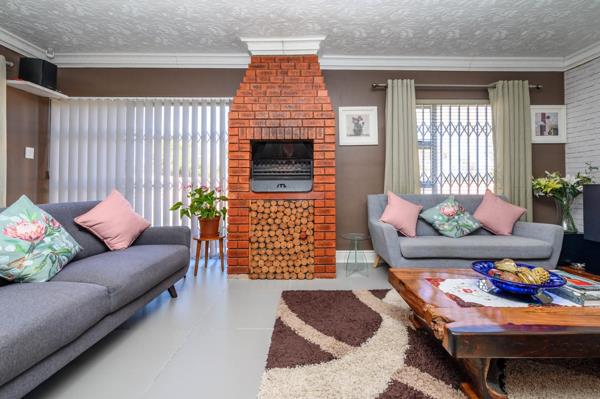 Inside, the home boasts a spacious lounge with a built-in braai and two sliding doors that open onto a cozy patio, creating an ideal indooroutdoor entertainment flow. All doors and windows are fitted with Trellidor security and aluminum frames, ensuring safety and peace of mind without compromising on aesthetic appeal. Daylight streams through multiple windows throughout the home, giving every room a bright and welcoming atmosphere. The separate dining room adds versatility and can also be used as a private office for work-from-home convenience.