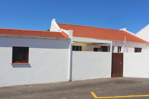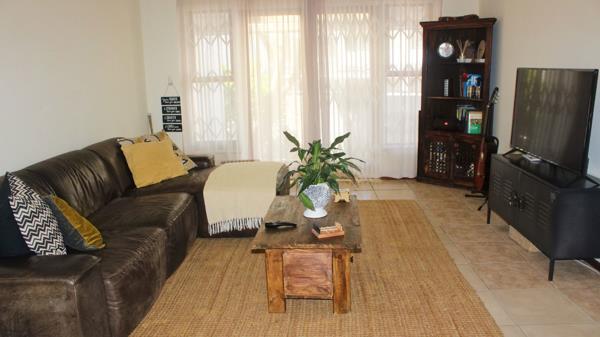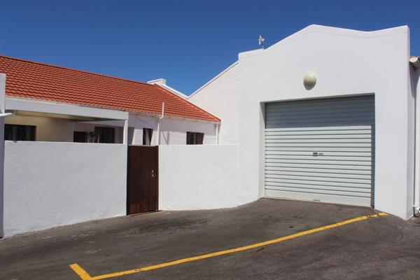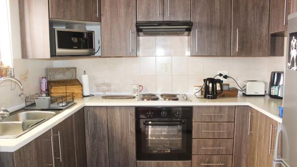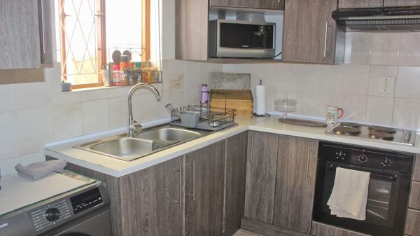 Fitted with trendy wood-look cabinets, elegant white granite tops, hob, undercounter oven, extractor fan, and double stainless steel sink, the kitchen also boasts a connection for a washing machine and space for a tall fridge. The three bedrooms are nicely proportioned with built-in cupboards, and there are two immaculate bathrooms one in the passage, the other a discreet en suite for the main bedroom. Other features include a compact back courtyard , a washing line, chandeliers, security gates, and burglar bars.