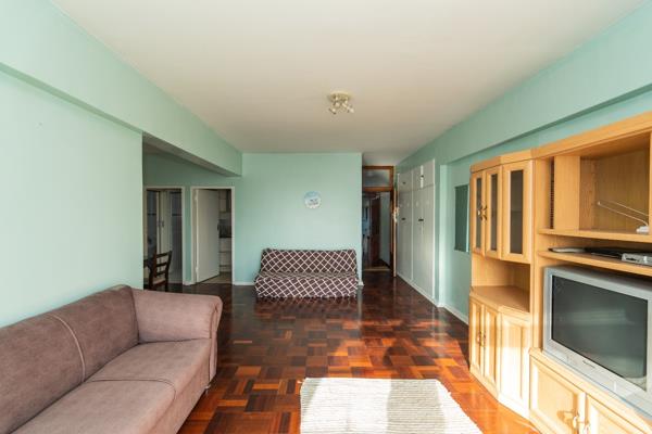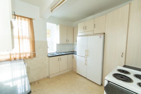 This 2-bedroom unit boasts an open-plan dining and living room, a kitchen with ample cupboard space, and a bathroom with both shower and bath.