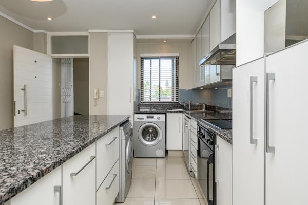 - Modern kitchen with granite tops, washing machine, and space for a dryer