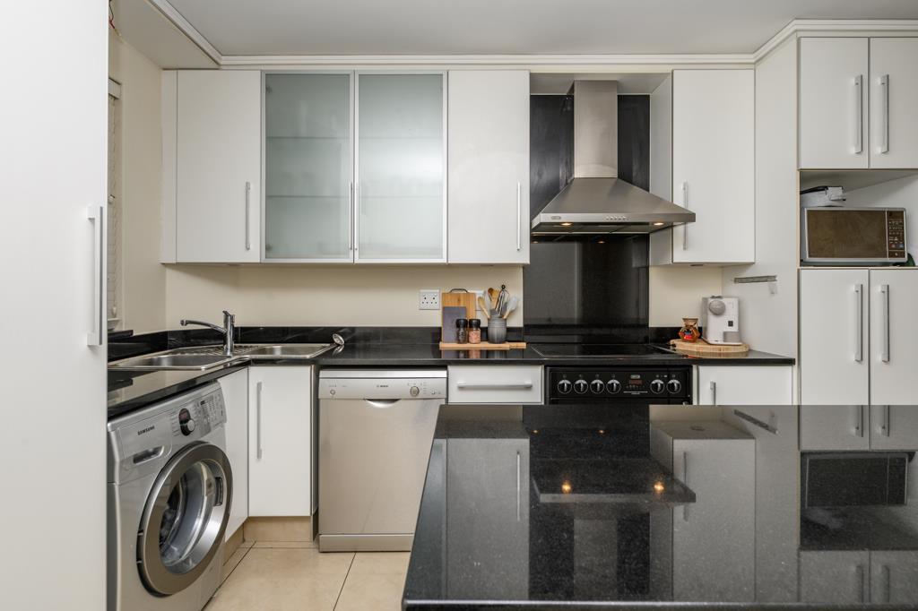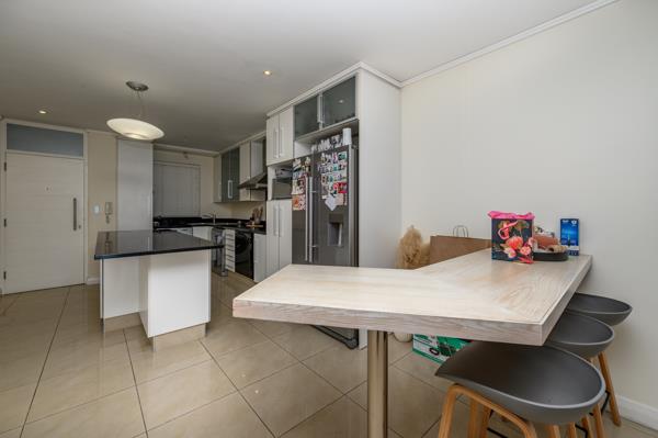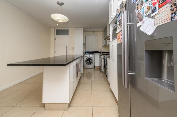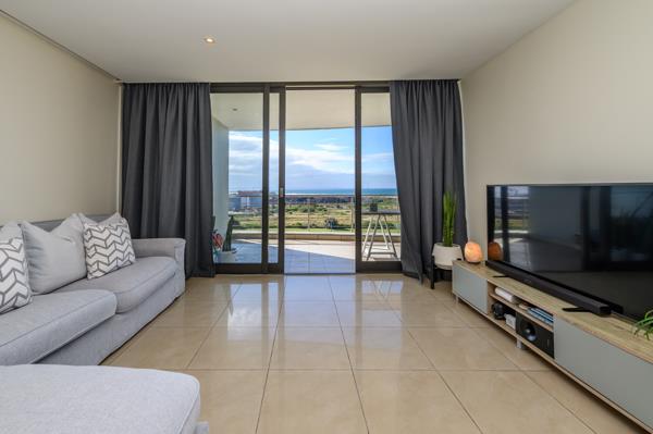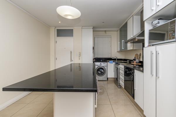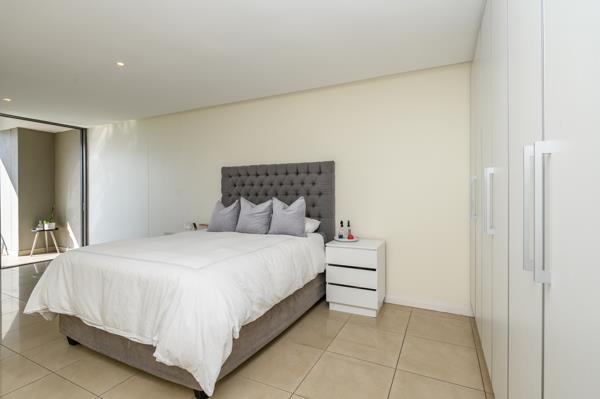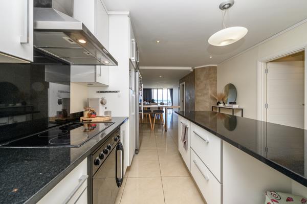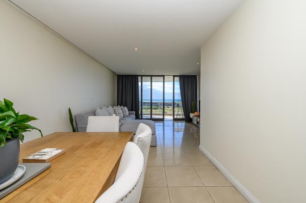 This modern apartment flows seamlessly in clean, contemporary lines from the open-plan kitchen through the dining area and into the lounge, which opens onto a spacious patio with stunning sea views, from where light pours into the home.