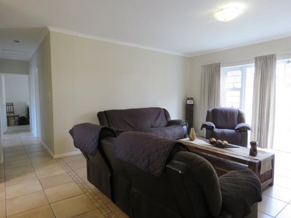 A spacious open plan tiled lounge/dining area flowing to a functional kitchen fitted with oven and hob. Plenty of cupboard space with plumbing for a dishwasher and washing machine.