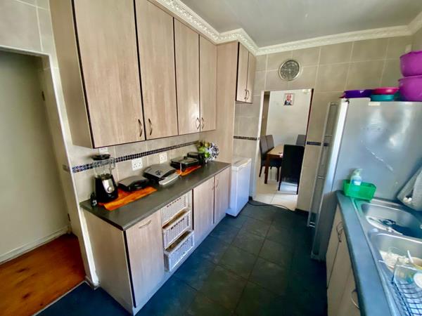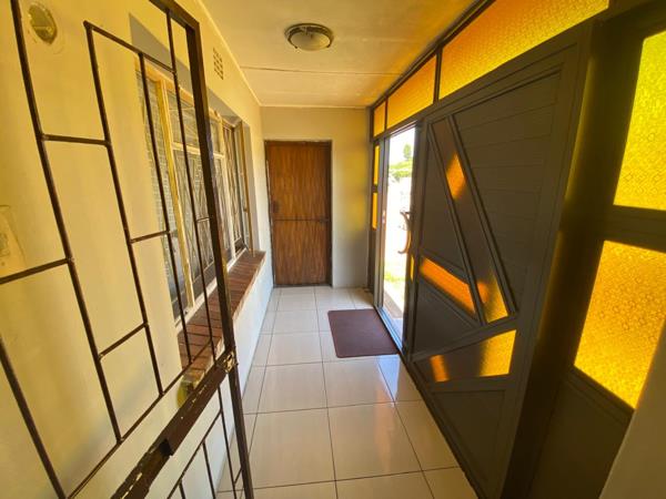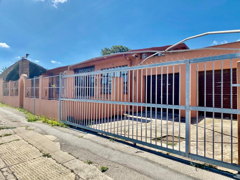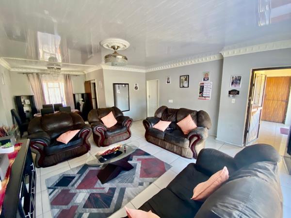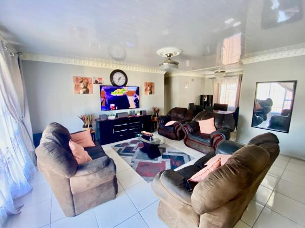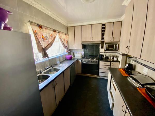 This spacious home offers 4 bedrooms with built-in cupboards, 2 bathrooms (1mes), lounge, dining room, fitted kitchen, thatched roof entertainment area with indoor braai and sliding doors opening onto pool, double garage, double carport, laundry all on enclosed corner erf with sliding gates.