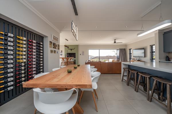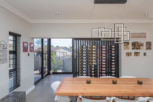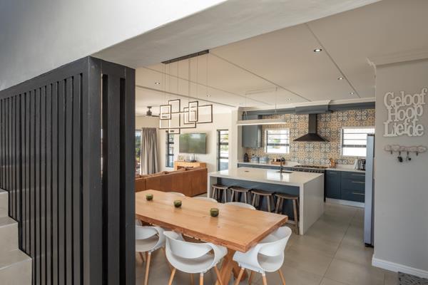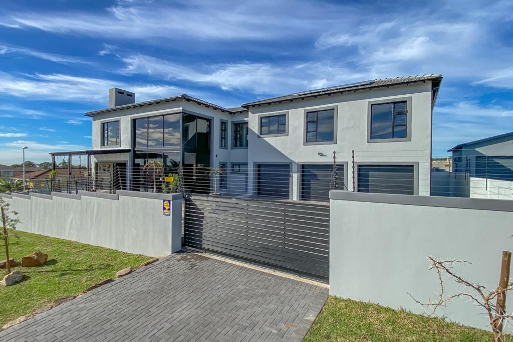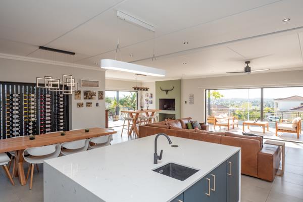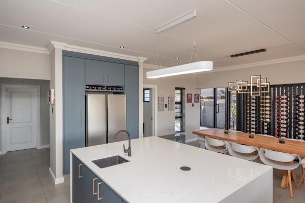 The living area downstairs offers an open plan lounge and dining as well as a lovely additional living space with a built-in braai. The two covered patios are situated just off the indoor braai area and the lounge. A magnificent open plan kitchen offering a spacious quartz island, gas hob and electric oven, space for a double door fridge and a generous number of cupboards and counter space. As if that wasn''t enough, there is also space for under-counter appliances, a massive scullery and pantry.