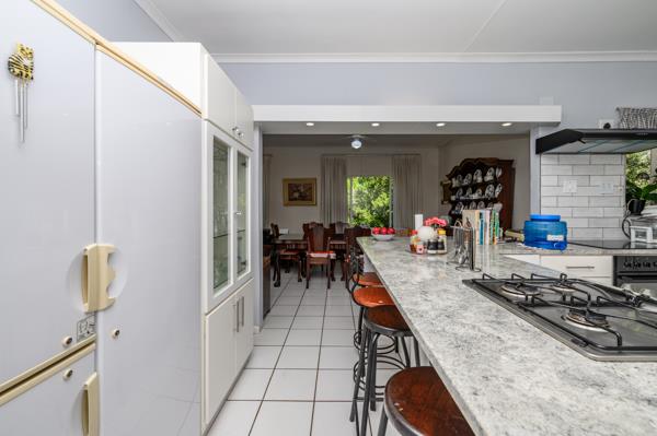 The open plan kitchen has plenty of built-in cupboards, under under-counter oven and hob, plus a gas hob for those load shedding days.