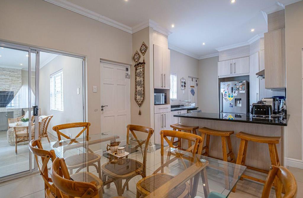The extended indoor braai area is a standout feature, with its warm tones and abundance of natural light pouring in. The elegant American shutters and stacker doors allow for easy access to the private garden, making it an ideal space for relaxing or enjoying outdoor dining.