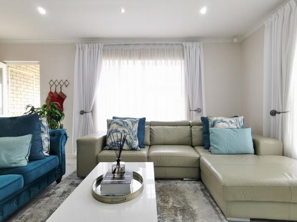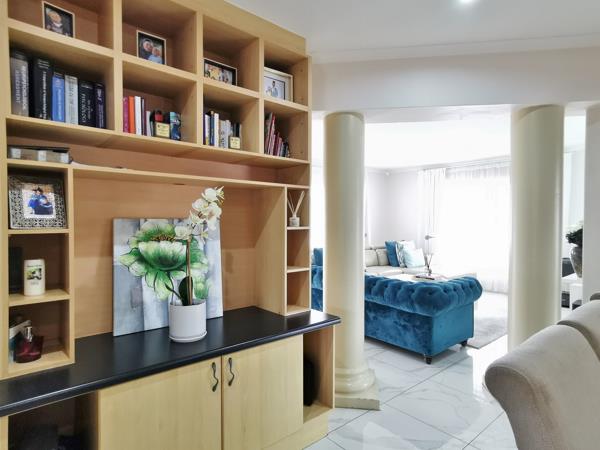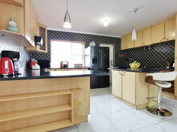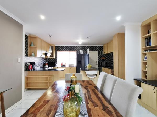 The modern open-plan kitchen flows seamlessly through the dining area into the entertainment room with built-in braai, and continues to a covered patio that leads out to a sunny swimming pool and well-maintained backyard.