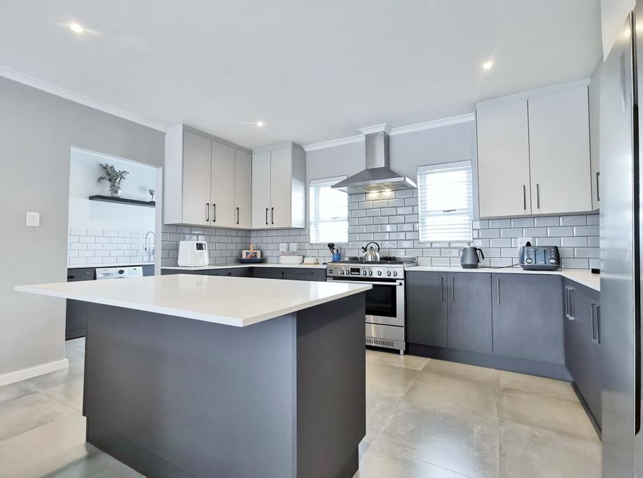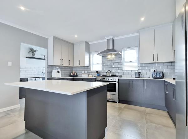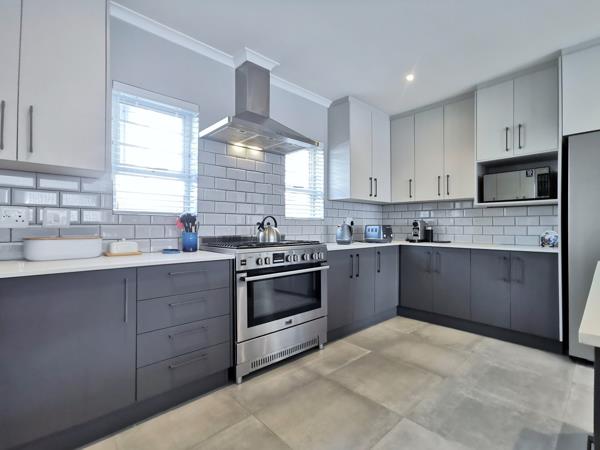The home features 3 spacious bedrooms and 2 bathrooms, including a full main en-suite. The heart of the home is a modern open-plan kitchen with a centre island, quartz countertops, gas hob, stainless steel cooker hood and a separate scullery with wet points. The kitchen flows effortlessly into the dining and living areas, which extend into an indoor entertainment room with built-in braai, ideal for hosting year-round.